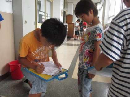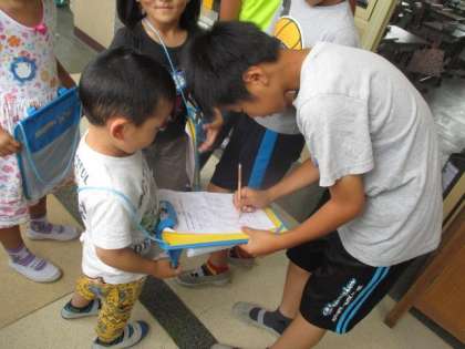 1年生は生活科の学習でサインをいろいろな人からもらっています。運動会や縦割り活動で同じ班になった6年生を見つけると、嬉しそうにサインをもらっていました。6年生も照れながらもやさしく対応していました。