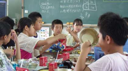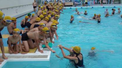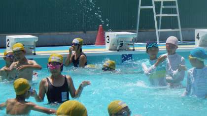 第二初級学校の6年生の児童とプールで交流会をしました。碁石拾いやリレーなど、いろいろな活動を時間を忘れて楽しみました。初級学校の児童とも仲良くなり、給食時間はお互いに学校のことなどを楽しく話していました。