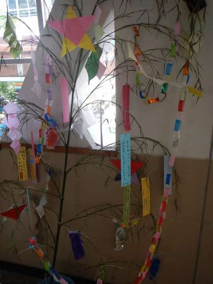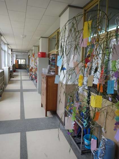 校舎内には,たくさんの願いごとが書かれた短冊が笹につるされています。