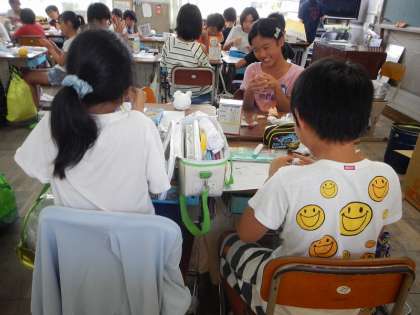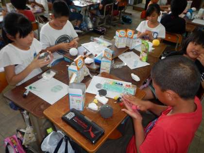 図工の学習で,自分でテーマを決めて風鈴を作っています。どんな風鈴にするか設計図を書いて,今回は粘土に絵具を混ぜながら風鈴の形を作っていきました。色を混ぜるのがなかなか難しそうでしたが,思う色になるように一生懸命作っていました。