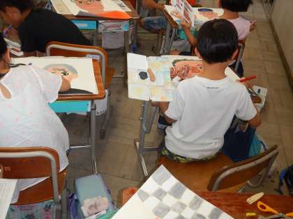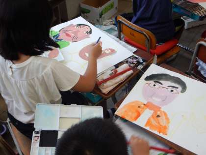 絵の具を使って,ていねいに色をぬっています。この後,コンテなどを使って背景を仕上げたり,メッセージをかいたりする予定です。