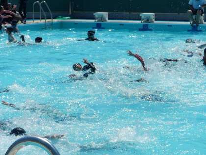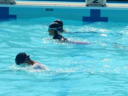 着衣で水に落ちたらどういう状態になるのか,着衣の時どんな泳法で,どのように泳いだらいいのか,着衣や履き物の種類が,泳力にどのように影響するのか,ペットボトルなど身近な浮き具をどのように利用するかなど,実際に普段の生活の中で起こりうることを想定し,着衣水泳を行いました。