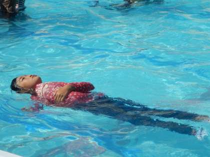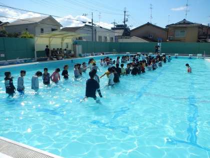 いつもの水泳学習と比べて,着衣の状態で泳いだり浮かんだりしていることの大変さを実感していました。ペットボトルを服の中に入れたり,あごの下に置いたりといろいろな工夫をしていました。また,スーパーの袋でも浮かべることも学習していました。