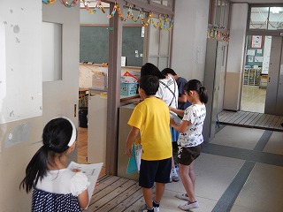 社会科の学習で,グループで校内のどこに防火設備があるのかを探しました。探してみると,いろいろな場所に防火バケツや消火器を見つけることができました。今度消防署の見学も行う予定をしています。