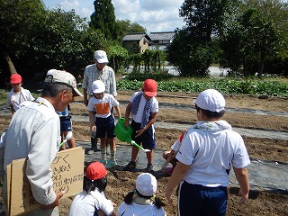 たねをまいた後は,そっと土をかぶせていきました。最後に水をまいて今日の活動は終了です。次は10月に間引きをする予定をしています。12月の収穫を目指して,次の畑の学校も楽しみにしたいと思います。