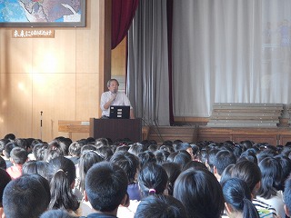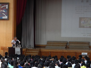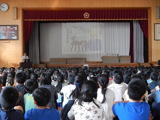 校長先生からは,先日行われた「松尾福祉ふれあいまつり」の様子と交通安全ポスターに入賞した子ども達の,表彰式のお話がありました。また,入賞した交通安全ポスターを見ながら,「安全」についても全校で確認をしていきました。他にも,日図デザイン博物館への寄贈に関する感謝状を6年生の児童が受け取りました。