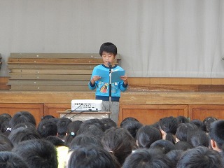 朝会の後半では,4年生の『松尾タイム』があり,4年生の代表の児童が「みさきの家」に行ったときに感じたことを作文で発表しました。