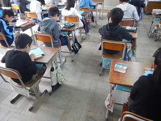 彫刻刀でていねに線彫りをしたり,他の彫り方の見本を見たりしながら,真剣な表情で彫り進めていました。