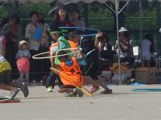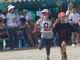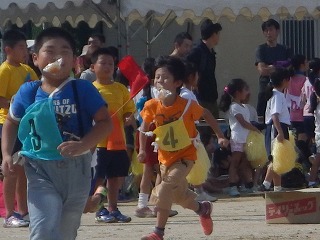 一生懸命パンの入った袋をくわえながら,走っていました。