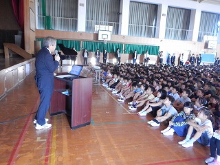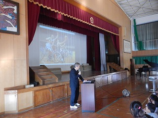 校長先生からは,6年生の車いすバスケット学習や5年生の山の家など10月のいろいろな行事のお話がありました。また,ジュニア京都検定のお話では,全校で京都についての問題を考えました。