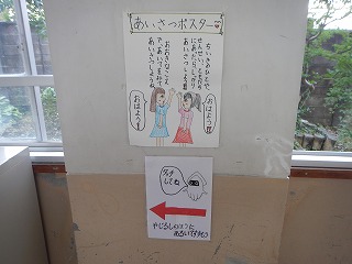 先日の児童朝会でも紹介があった,楽しみながら右側通行をするための取組が始まっています。廊下を歩いていると,右手でちょうどさわれるところに,かわいい絵とコメントが貼ってあります。この取組を通して,右側をしっかり歩く習慣が,今よりもっと身に付くようになったら良いと思います。