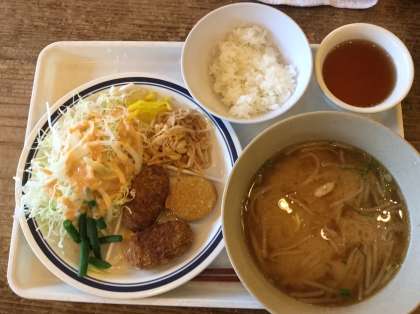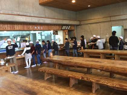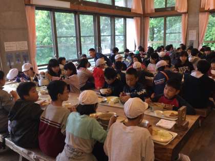 昼食の時間になりました。初めての山の家でのバイキングです。主食は,味噌ラーメンか鳥の照り焼き丼か選べます。ラーメンを選んだ子どもの方が多かったような・・・。みんなお腹が減っていたのか、おかずやサラダのおかわりをする子どもがたくさんいました。みんなとても楽しそうです。