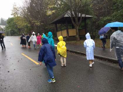 雨が降っていますが,外でスコアオリエンテーリングをしました。ポイントを探して,そこに書いてある問題を解いていきます。グループで協力することが求められる活動です。すべてのポイントにたどり着き,問題を解くことができるでしょうか。結果は………。帰ってからお家で聞いてみてください。