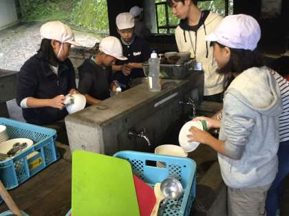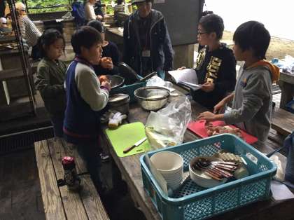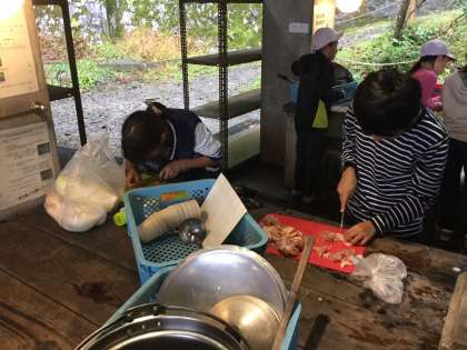 野外炊事「すき焼風煮」づくりに取りかかりました。所員の方の説明をしっかり聞き,さあ活動開始。みんなで力を合わせ,協力しておいしい「すき焼風煮」を作るぞ!みんなの気持ちがひとつになり,野外炊事に一生懸命取り組んでいます。