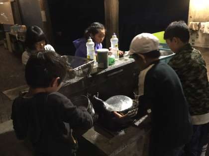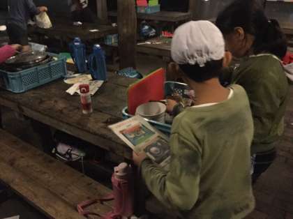 おいしくご飯をいただいた後は,後片付けタイム。鍋についたご飯粒や鍋のまわりについたススを取るのが大変です。洗い終わったら,青いカゴに元どおりに入れなくてはいけません。「あ!ピーラーがない。どこいったピーラー」と,大騒ぎしながらみんなで後片付けをしています。