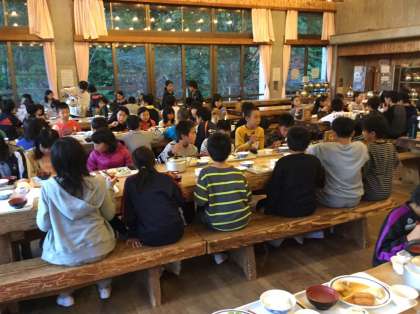 少し早めの夕食タイムとなりました。みんな山登りをした後で,お腹が減っているのか,すごい勢いで食べていました。特に人気だったのはクリームコロッケで,揚げたてのコロッケに大行列が・・・。夕食後は,天体観測です。夕方に晴れ間が見られたので,たくさんの星が観察できるといいなと思います。