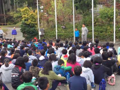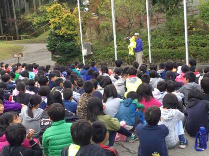 おはようございます。3日目の朝を迎えました。空は今のところ晴れていて,今日も予定している活動ができそうです。7時より朝のつどいを3校合同で行い、山の家の紹介や,各校の学校紹介を聞きました。山の家のカエル「はなころちゃん」が登場して,みんな驚いていました。