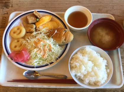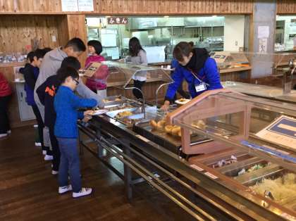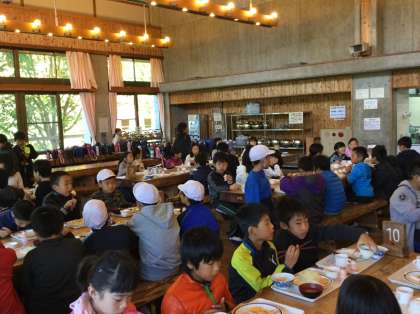 朝食の時間になりました。みんなぐっすり眠れたのか,食欲も旺盛で,おかわりをする子どもが多くいました。一番人気は,ニコちゃんポテトで「おいしい。これ持って帰りたいくらいや。」と言いながら喜んで食べていました。みんな元気です。
