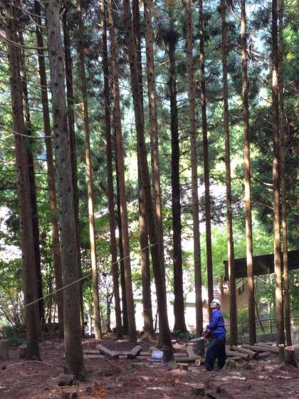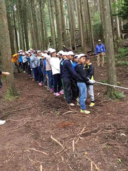林業体験は,まず始めに杉の木をみんなで倒します。杉の木にロープを巻き,そのロープをみんなで引っ張ります。みんなの力がひとつになり,見事大きな木が倒れました。倒れた瞬間,大歓声が湧き起こりました。次はこの木を輪切りにします。