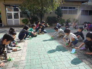 理科の学習で,今日は鏡に太陽の光を反射させる実験をしました。太陽の光を鏡で受け止め,その反射した光をもう片方の鏡で反射させると・・・。久しぶりの太陽の日差しで楽しく実験ができました。