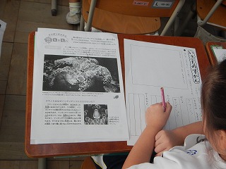 これまで国語「うみのかくれんぼ」で学習してきたことを生かして,いきものずかんを作ります。どんな生き物がどんなふうに生活しているのかを図鑑や科学読み物などを使って調べていきます。