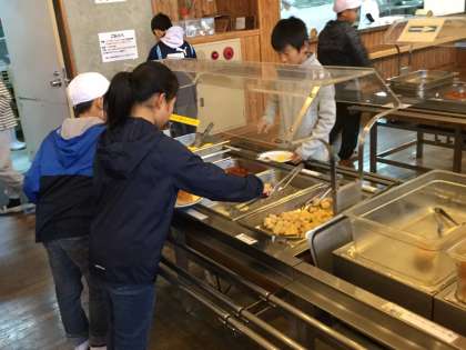 とうとう食堂でいただく最後の食事の時間がやってきました。子ども達は,このバイキングでの食事をとても気に入ったようで,「もっと、ここで食べたい。」「この味噌汁、最高においしかった。」と,この食堂での食事を名残惜しみながら,味わって食べていました。今日の人気メニューは,やはりミートボールで,あっという間になくなり,すぐに追加していただきました。この後は,最後の大きな活動,カレーライス作りです。今日のめあて「Smile」を心がけてがんばります。