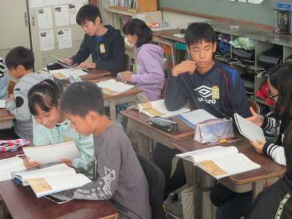 国語では「鳥獣戯画を読む」という学習に入りました。鳥獣戯画とは右京区の高山寺にある平安時代の絵巻物です。子どもたちは全然気付かなかった絵の特徴がよく分かったようで,1枚の絵から様々な想像を膨らませていました。