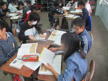 「鳥獣戯画を読む」の学習では、作者の工夫をたくさん見つけました。さまざまな言葉を巧みに使って絵の評価をしてあり,本文の中から次々に見つけていました。また,実際に鳥獣戯画の絵を見て,自分たちで,蛙の表情やポーズからどういう気分を表しているか考えました。「驚いている」「野次を言っている」「逃げようとしている」などとそれぞれが個性的な考えがを出していました。