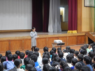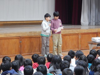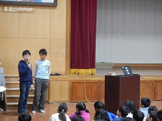 今回の児童朝会では,本部から12月20日に予定されている「松尾フェスティバル」の話と,環境委員からアルミ缶集めの結果発表がありました。今回,一番アルミ缶を集めたのは,3年生でした。次回は1月に予定されています。
