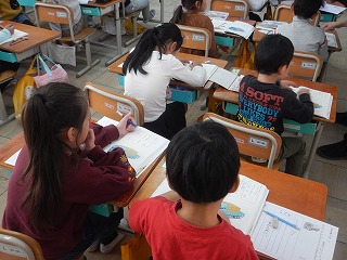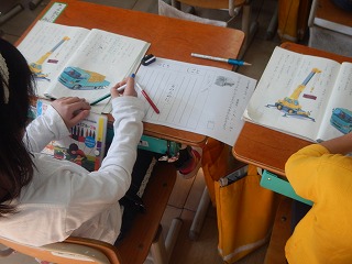 いろいろな役に立つ自動車がどんどん登場します。どんな仕事に使われ,どんなしくみをもっているのかなど,順番に読み取っています。説明文にもだんだん慣れてきた1年生。教科書を指でなぞりながら一生懸命答えを見つけています。