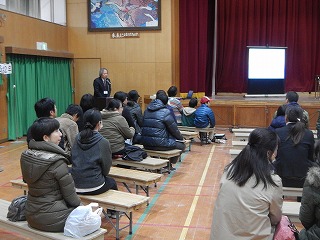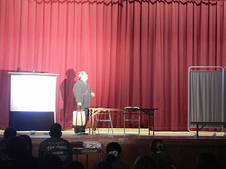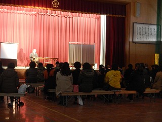 今年度は,教室で学級懇談会ではなく,体育館に移動をし,人権劇を鑑賞してもらいました。翔鸞幼稚園 園長 古森先生に来ていただき,ひとり芝居「最期のひとこと」を保護者の方と一緒に鑑賞しました。