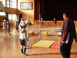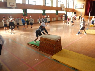 順番や遊び方を守って,安全に仲よく運動しています。遠くに跳んだり,高く跳んだり運動の仕方をみんなで工夫して見付けています。