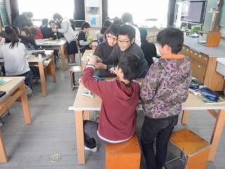実験用てことおもりを使って,つり合いを調べました。