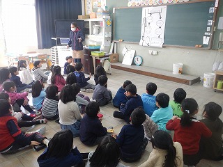 松尾小学校の近くにある,つみき保育園,葉室幼稚園,松尾幼稚園の年長さんを招いて,明日9日に交流会を行います。来てくれる園児に,1年生が地域の方に教えてもらった昔の遊びを教えます。今日は,案内する順番を確かめたり,役割を確認したりしました。