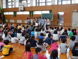 これから1・2年生でいろいろな活動をしていきます。今日は2年生の司会で,1・2年生の顔合せをしました。とっても上手なはじめの言葉の後は,クイズの係の子どもたちから1年生に,○×ゲームをしました。「校長先生の名前は?」「なわとび広場で遊んでいいのは?」と,とっても楽しそうでした。