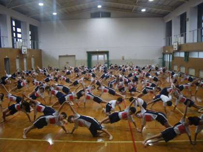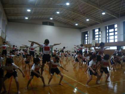 組体操の練習を頑張っています。今日は音楽に合わせて2人組と3人組の技をしました。回数を重ねるごとに上手になってきています。