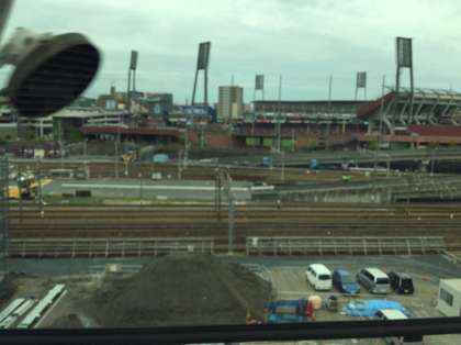 10時31分,広島駅に到着するアナウンスが流れ,窓から外を見ると,何と広島スタジアムが。野球好きの子ども達は大喜びしていました。そして,その後すぐに広島駅に着きました。