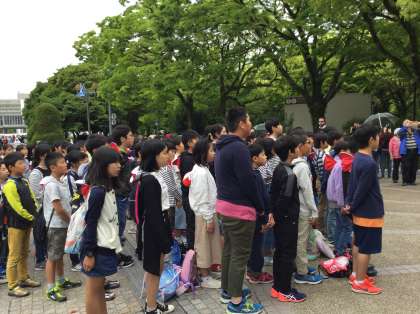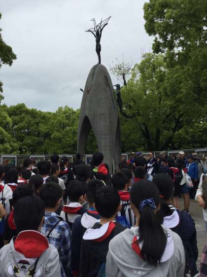 11時25分,原爆の子の像の前で,平和集会を行いました。たくさんの人が見守る中,平和宣言をした後,折り鶴を捧げ,みんなで「ヒロシマの有る国で」を歌いました。きっと,みんなの平和への思いは,多くの人々に届いたことと思います。平和集会に取り組むみんなの姿を見て,胸が熱くなりました。