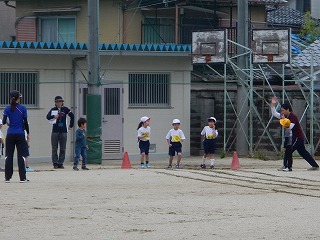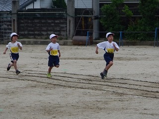 1年生みんなで,運動会に向けて50m走をしました。はじめは走るコースを覚えるために,軽く走る練習なのに,1年生はもうみんな全力です。まだまだ小さな体をめいいっぱい使って,一生懸命走っていました。
