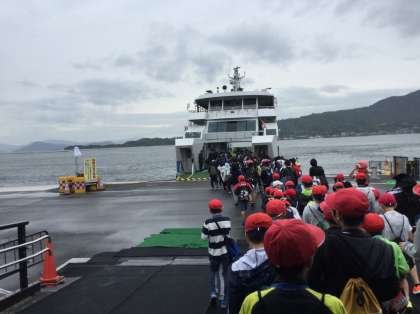 15時45分,宮島口駅に到着し,フェリーに乗って宮島に渡ります。みんなは,みさきの家に行く時に乗った船をイメージしていたのか,その大きさにびっくりしていました。