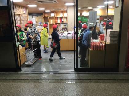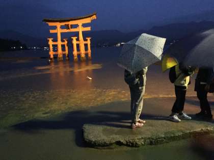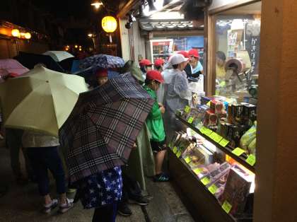 雨が降っていますが、ライトアップされた鳥居を見た後、おみやげを買いに行きました。