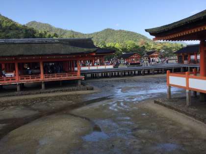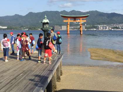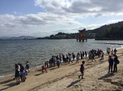 8時,厳島神社に到着し,世界文化遺産の重みを感じながら見学しました。その後,水族館が開館するまで,海辺で楽しいひとときを過ごしました。