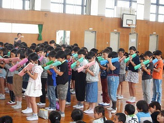 2年生から6年生は,1年生に喜んでもらおうと,歌やけんばんハーモニカの演奏,小学校に関するクイズなど,工夫をこらした出し物をしていました。