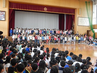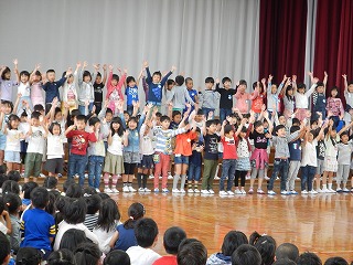 最後に1年生からお礼の言葉と歌のお返しがありました。1年生が発表の最後に「どうでしたかー?」と聞くと,全校生徒から「かわいいー!」と大きな返事が返っていました。