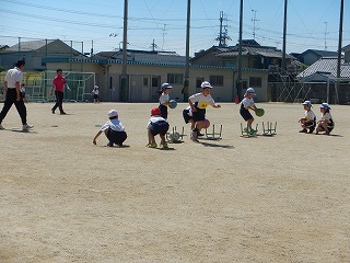運動場に出て,障害物走の練習を行いました。本番と同じ運動場で,みんなのびのびと練習をしていました。青空の下運動場をごろごろするのはとても気持ちよさそうでした。