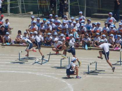 プログラムNo.16 3年生による障害物走「アイスクリンピック」が始まりました。次は,プログラムNo.17 1年生の50m走です。