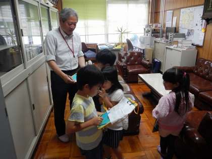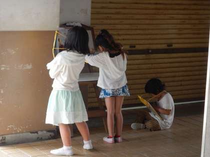 学校の地図と2年生に教えてもらったことをたよりに,グループで探検しました。ポイントを見つけて,チェックのシールを貼っていきました。
