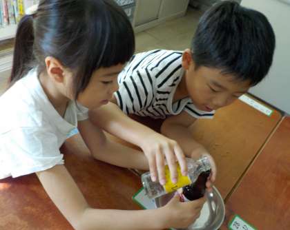 算数の学習で,どちらの容器の方が水が多く入るかを調べました。一方の容器に水を入れて,もう一方の容器に移し替えると,水があふれてきました。水のかさは,実際に水を移し替えたり,同じ入れ物に移し替えたりすると,比べることが出来ると分かりました。
