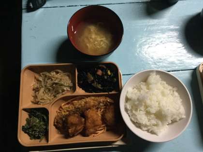 メニューは、エビフライ&唐揚げ弁当とかきたま汁です。