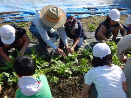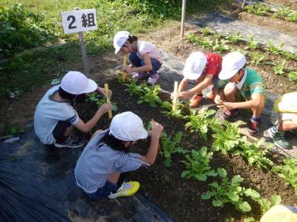 まず,苗の大きさを持ってきた30cm定規を使って測りました。その後,楽しみにしていた間引きをしました。一番元気な苗を残して,慎重に間引いていきます。他にも雑草をぬいたり,土よせをしたりと,おいしい大根になるように一生懸命活動しました。次の畑の学校までに,どれだけ大きく成長するのか楽しみです。